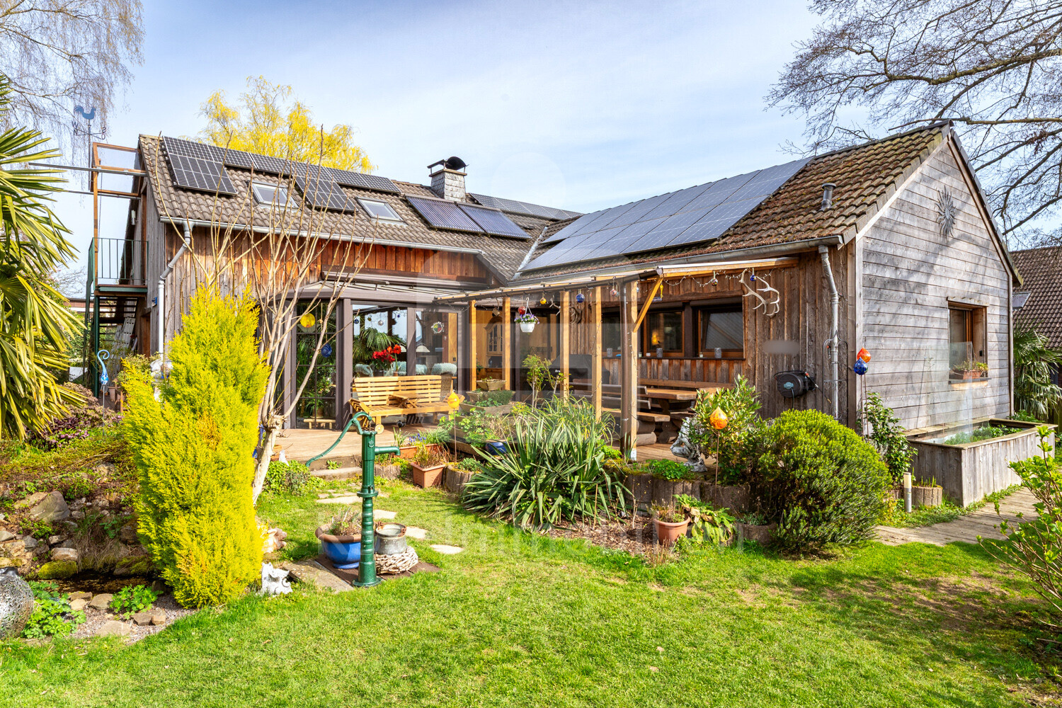 Mittelpunkt ist ein beeindruckender, ca. 50 m³ großer Schwimmteich, welcher derzeit als Koiteich genutzt wird. Die biologische Filteranlage mit Bachlauf, separatem Wasserspeicher und zweistufigem Pflanzenfiltersystem sorgt für eine natürliche Wasserreinigung.