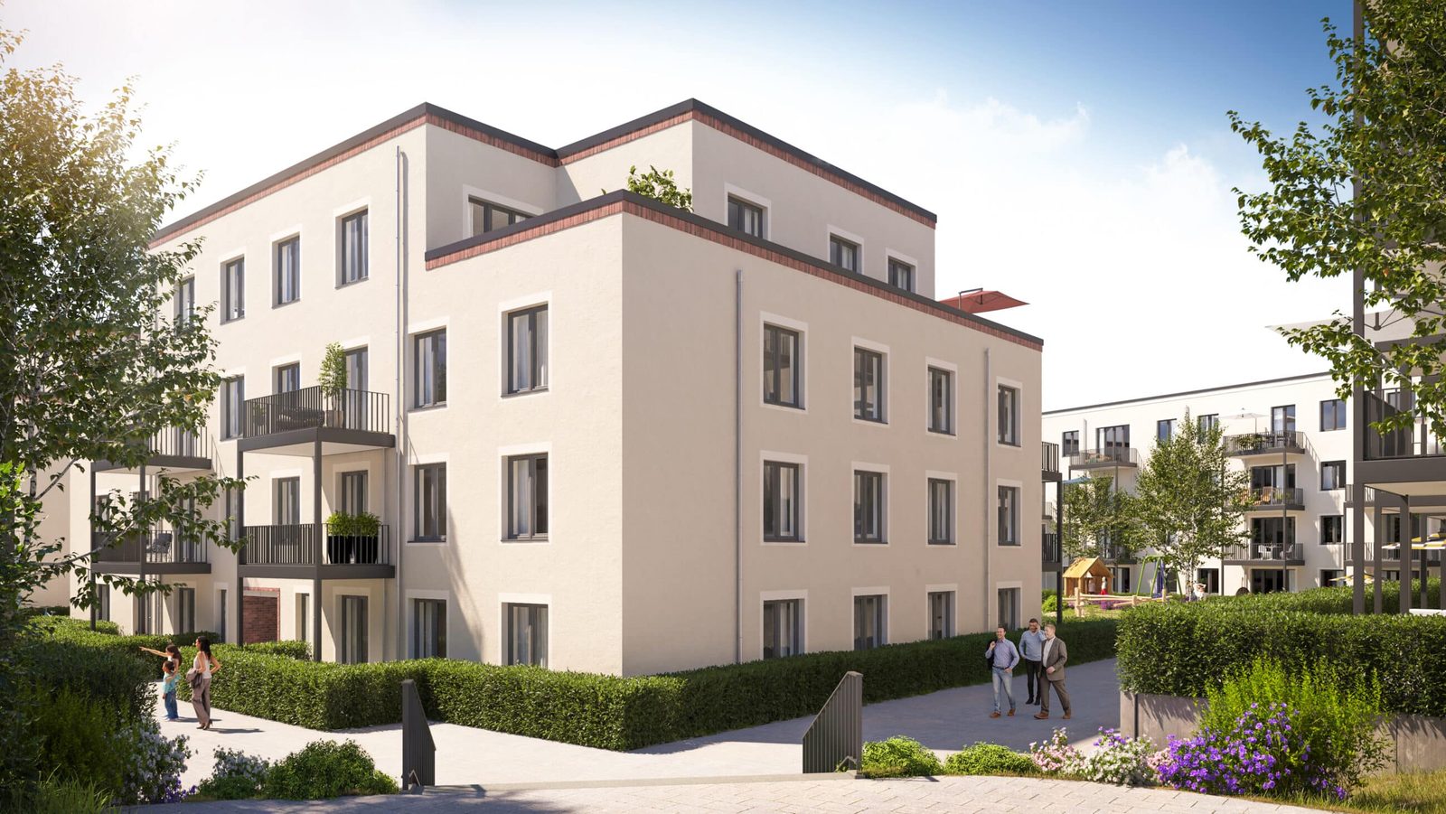 Auf drei Vollgeschossen und einem Staffelgeschoss bieten die 2- bis 5-Zimmer-Wohnungen mit Wohnflächen von ca. 51 m2 bis ca. 168 m2 vielfältigen Wohnraum für Best Ager und junge Familien. Jede der Wohnungen verfügt über einen eigenen Balkon oder eine Terrasse mit Südausrichtung. Zudem steht den Bewohner:innen eine Tiefgarage mit Stellplätzen zur Verfügung – auf Wunsch mit elektrischer Vorbereitung für eine Elektroauto-Ladestation – sowie ausreichend Fahrradstellplätze und insgesamt 8 Motorradstellplätzen.