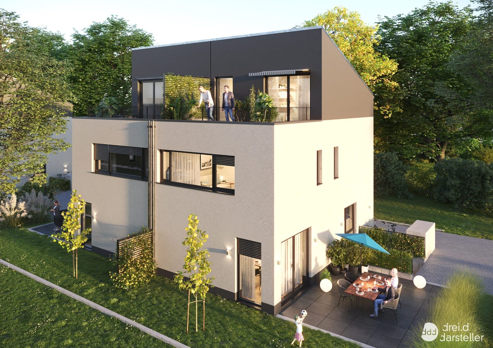 Neben den hochwertigen Ausstattungselementen innerhalb der Räumlichkeiten wird der Wohnkomfort einer jeden Einheit durch eine Terrasse mit eigenem Garten sowie eine Dachterrasse im 2. Obergeschoss gesteigert. Des Weiteren erhält jede Doppelhaushälfte einen separaten Pkw-Stellplatz vor dem Haus. In Absprache mit dem Bauträger können auch individuelle Gestaltungswünsche berücksichtigt werden.