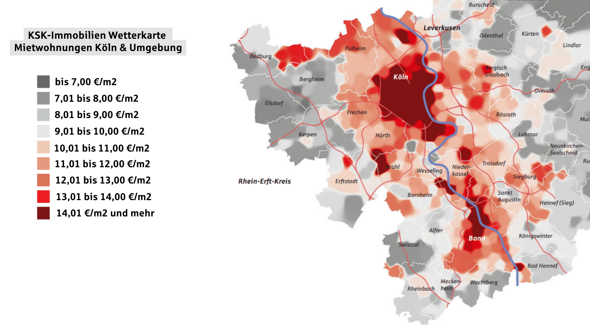 Um zu prüfen, ob die verlangte Miete zulässig ist, muss die ortsübliche Vergleichsmiete herangezogen werden. Diese ist im Kölner Mietspiegel festgelegt.